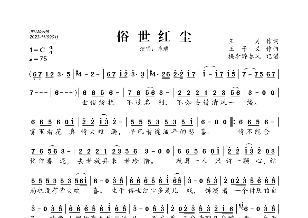 《俗世红尘》是陈瑞演唱的一首歌曲,拍号为4/4拍,歌曲速度为每分钟75拍,这份简谱共有一张高清图谱,图谱由 @桃李醉春风 编配上传。