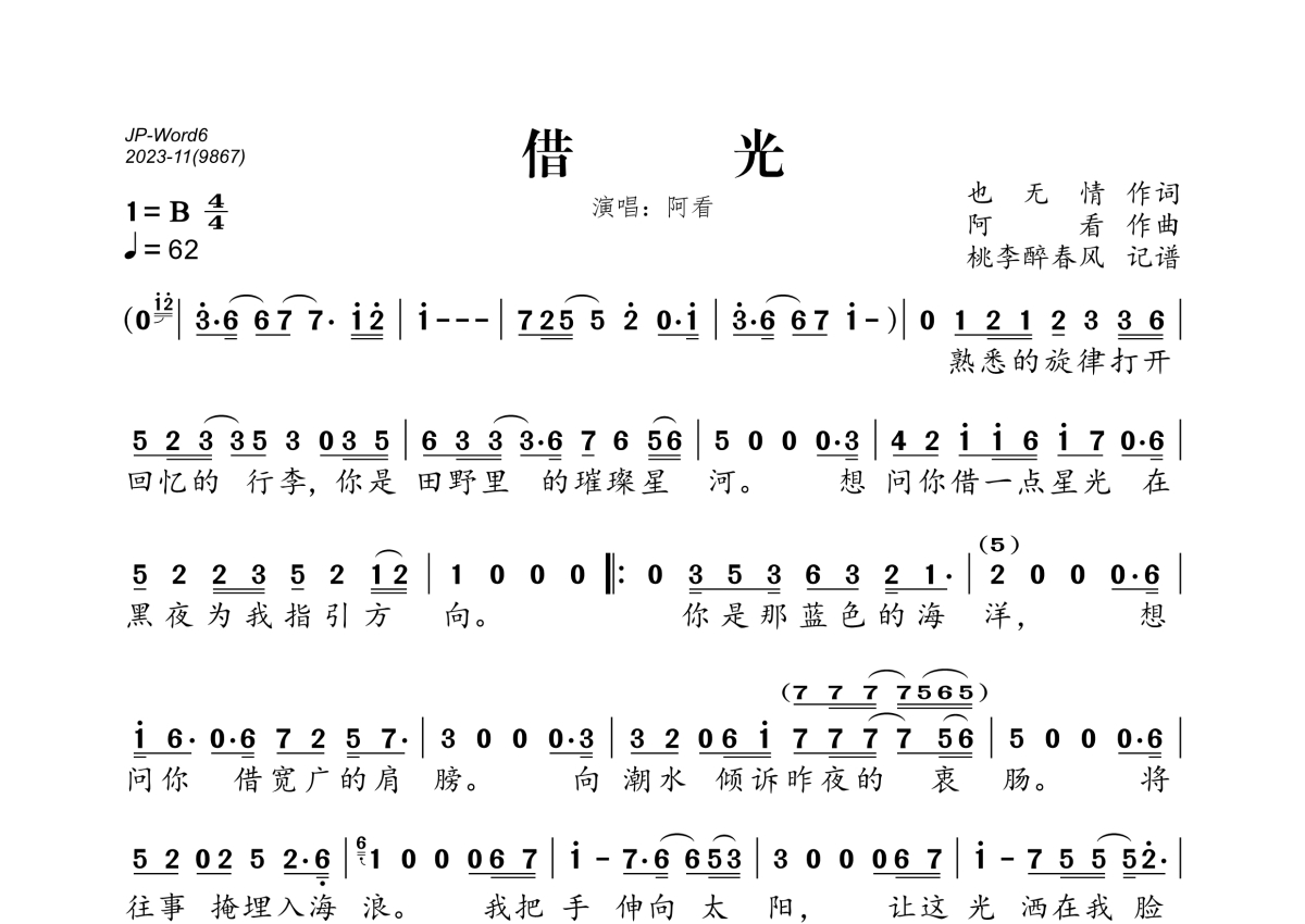 《借光》是阿看演唱的一首歌曲,拍号为4/4拍,歌曲速度为每分钟62拍,这份简谱共有一张高清图谱,图谱由 @桃李醉春风 编配上传。
