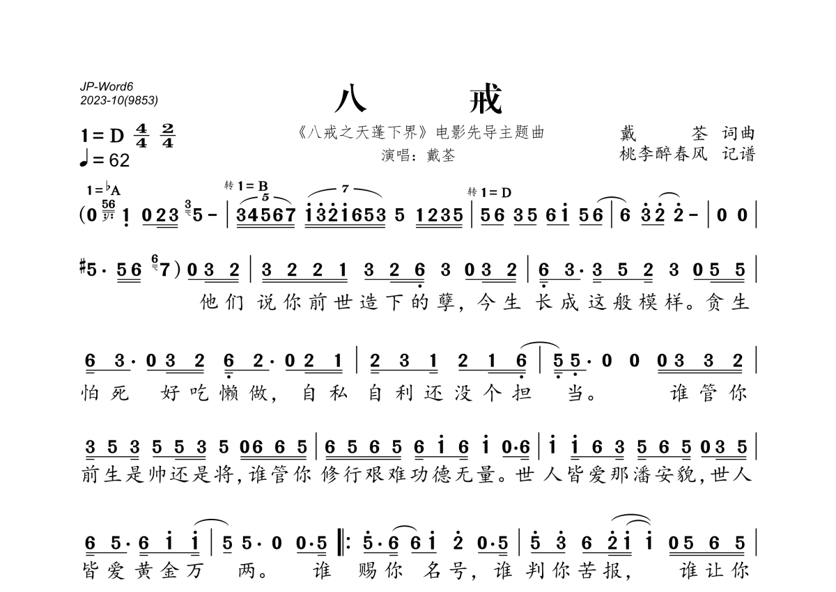 《八戒》是戴荃演唱的一首歌曲,拍号为4/4拍,歌曲速度为每分钟62拍,这份简谱共有两张高清图谱,图谱由 @桃李醉春风 编配上传。
