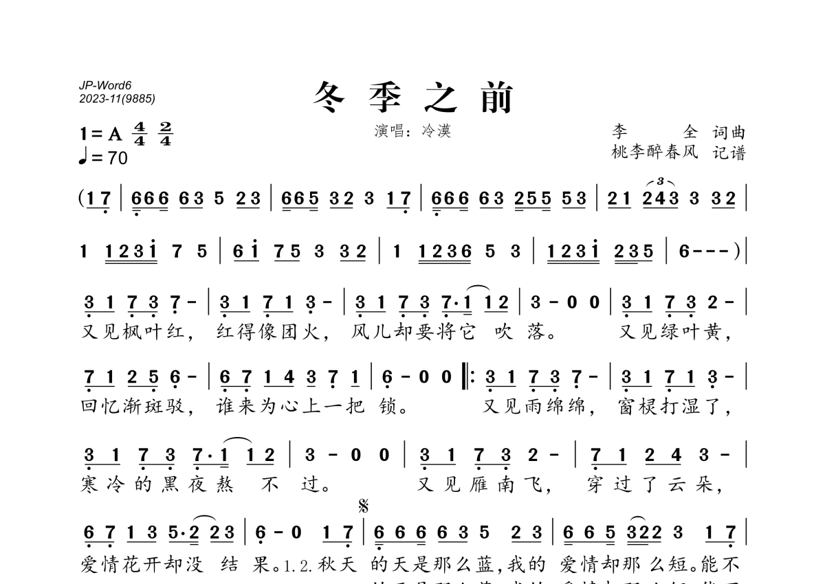 《冬季之前》是冷漠演唱的一首歌曲,拍号为4/4拍,歌曲速度为每分钟70拍,这份简谱共有一张高清图谱,图谱由 @桃李醉春风 编配上传。