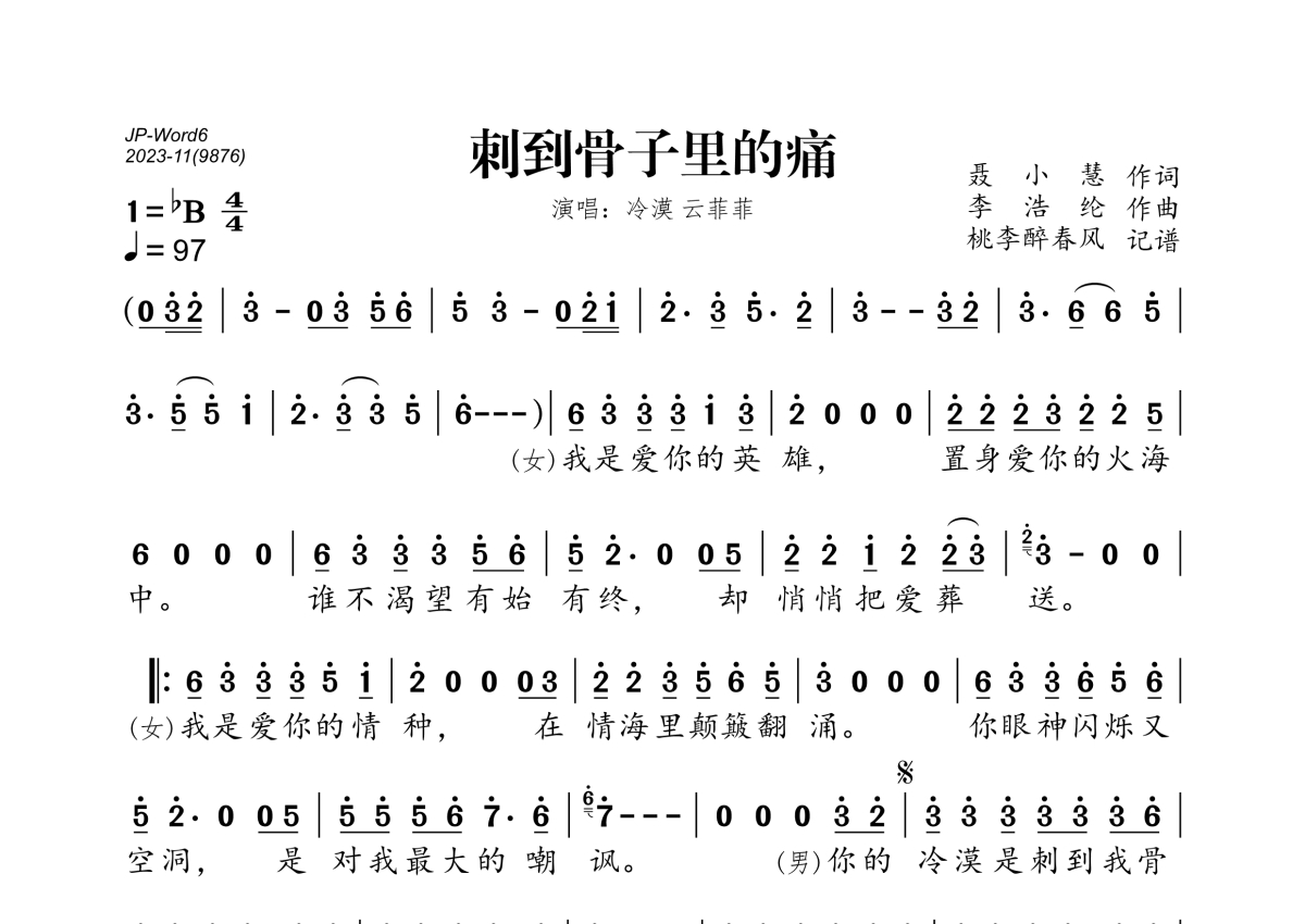 《刺到骨子里的痛》是冷漠/云菲菲演唱的一首歌曲,拍号为4/4拍,歌曲速度为每分钟97拍,这份简谱共有一张高清图谱,图谱由 @桃李醉春风 编配上传。