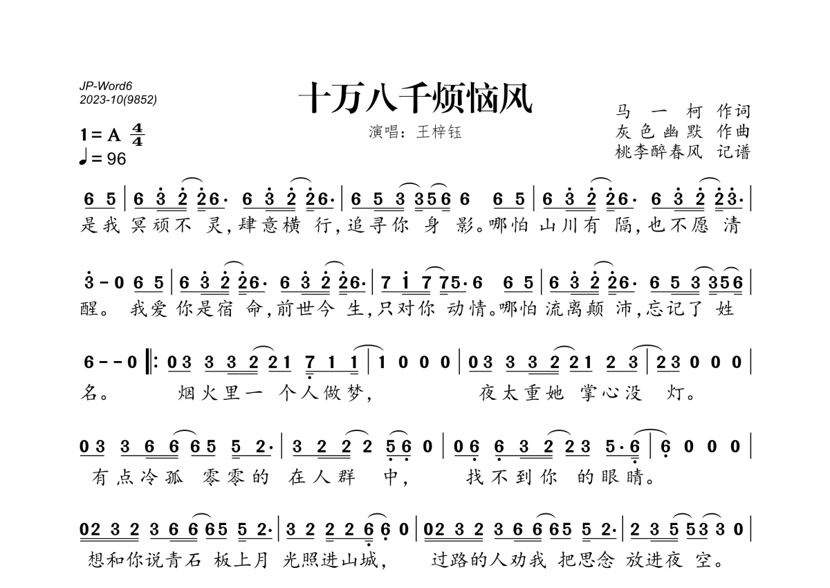 《十万八千烦恼风》是王梓钰演唱的一首歌曲,拍号为4/4拍,歌曲速度为每分钟96拍,这份简谱共有一张高清图谱,图谱由 @桃李醉春风 编配上传。