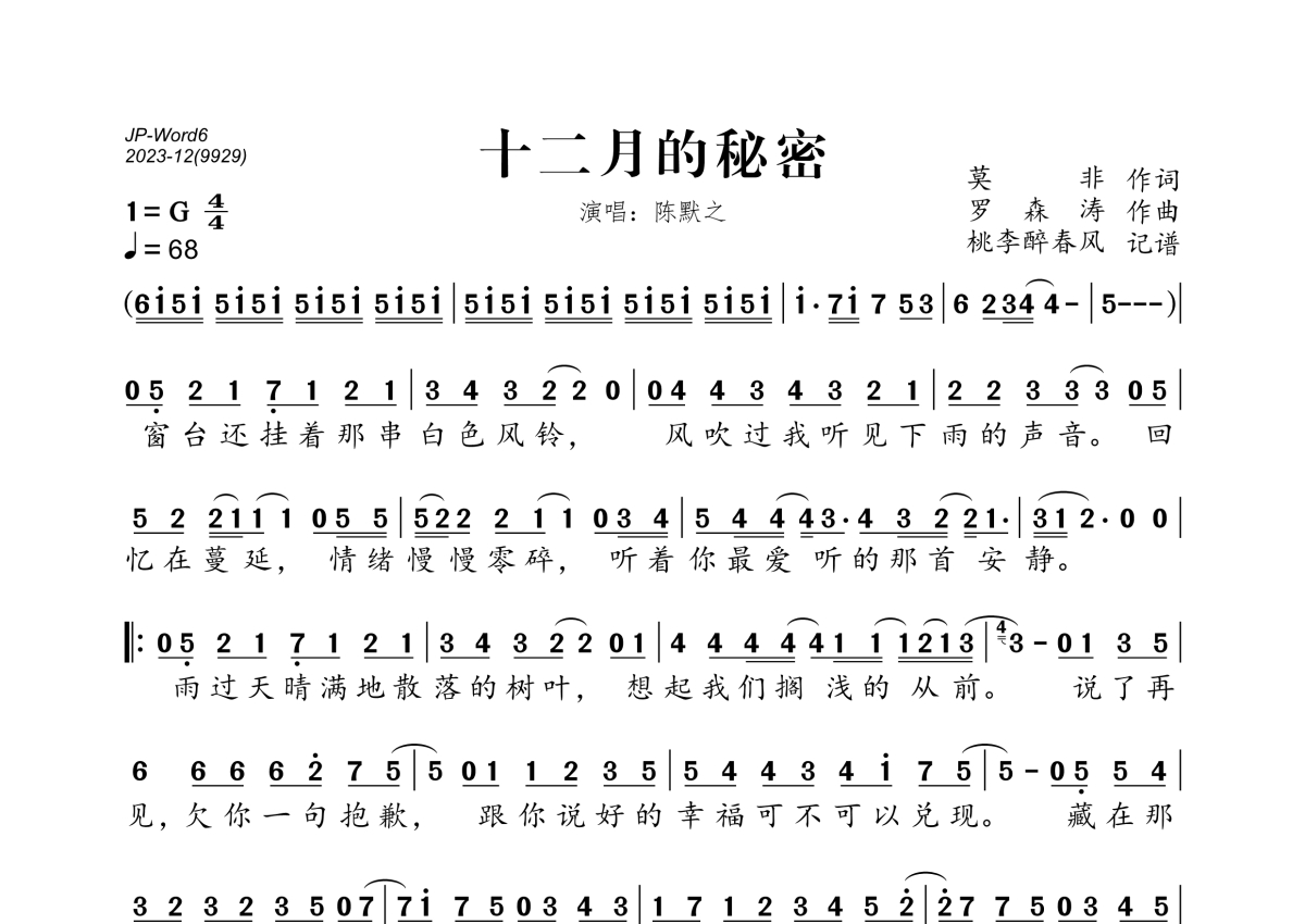 《十二月的秘密》是陈默之演唱的一首歌曲,拍号为4/4拍,歌曲速度为每分钟68拍,这份简谱共有一张高清图谱,图谱由 @桃李醉春风 编配上传。