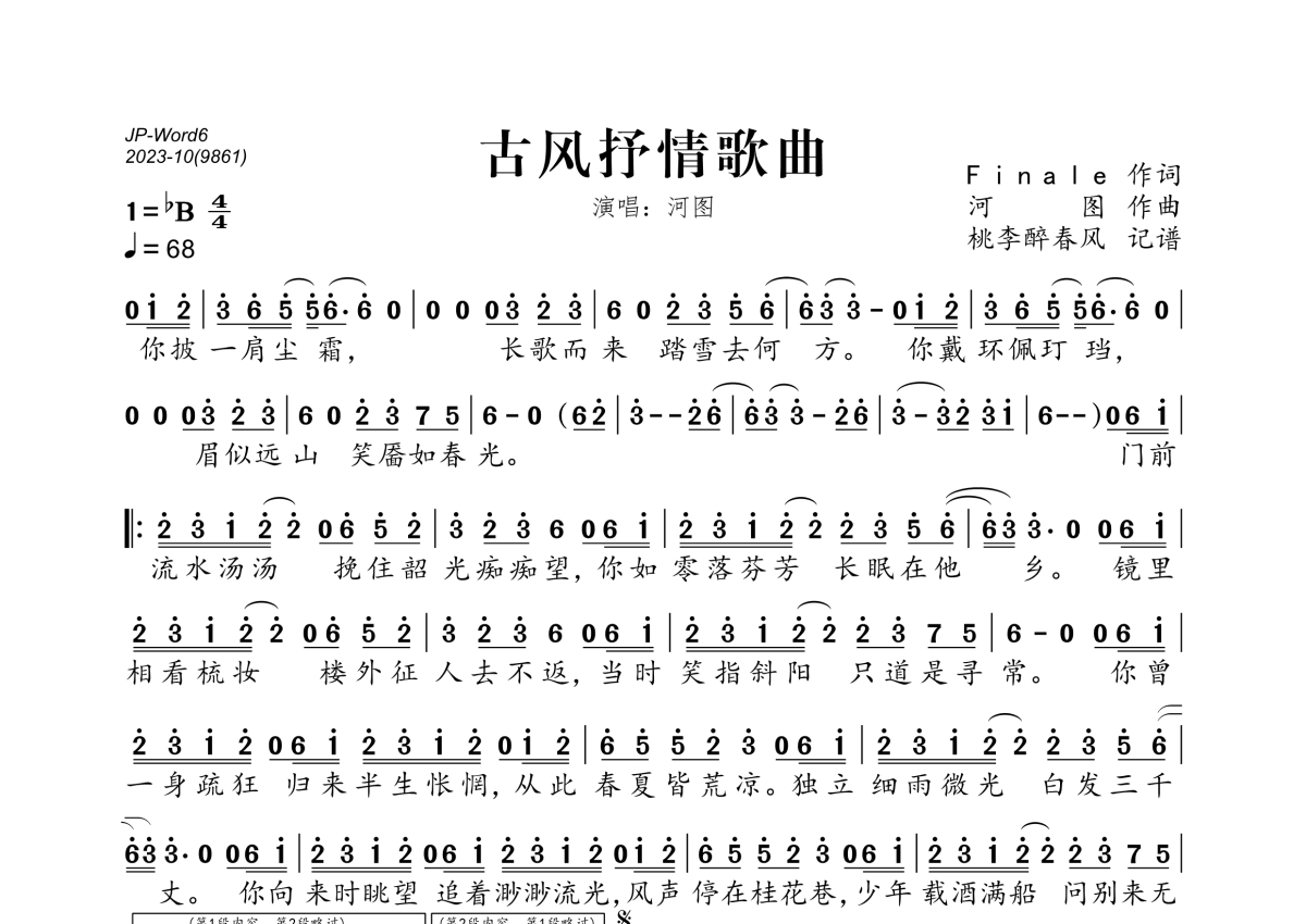 《古风抒情歌曲》是河西演唱的一首歌曲,拍号为4/4拍,歌曲速度为每分钟68拍,这份简谱共有一张高清图谱,图谱由 @桃李醉春风 编配上传。