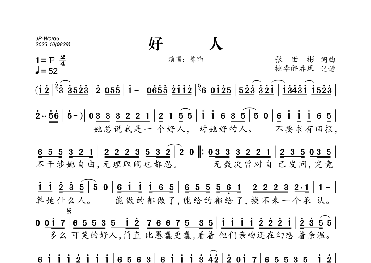 《好人》是陈瑞演唱的一首歌曲,拍号为2/4拍,歌曲速度为每分钟52拍,这份简谱共有一张高清图谱,图谱由 @桃李醉春风 编配上传。