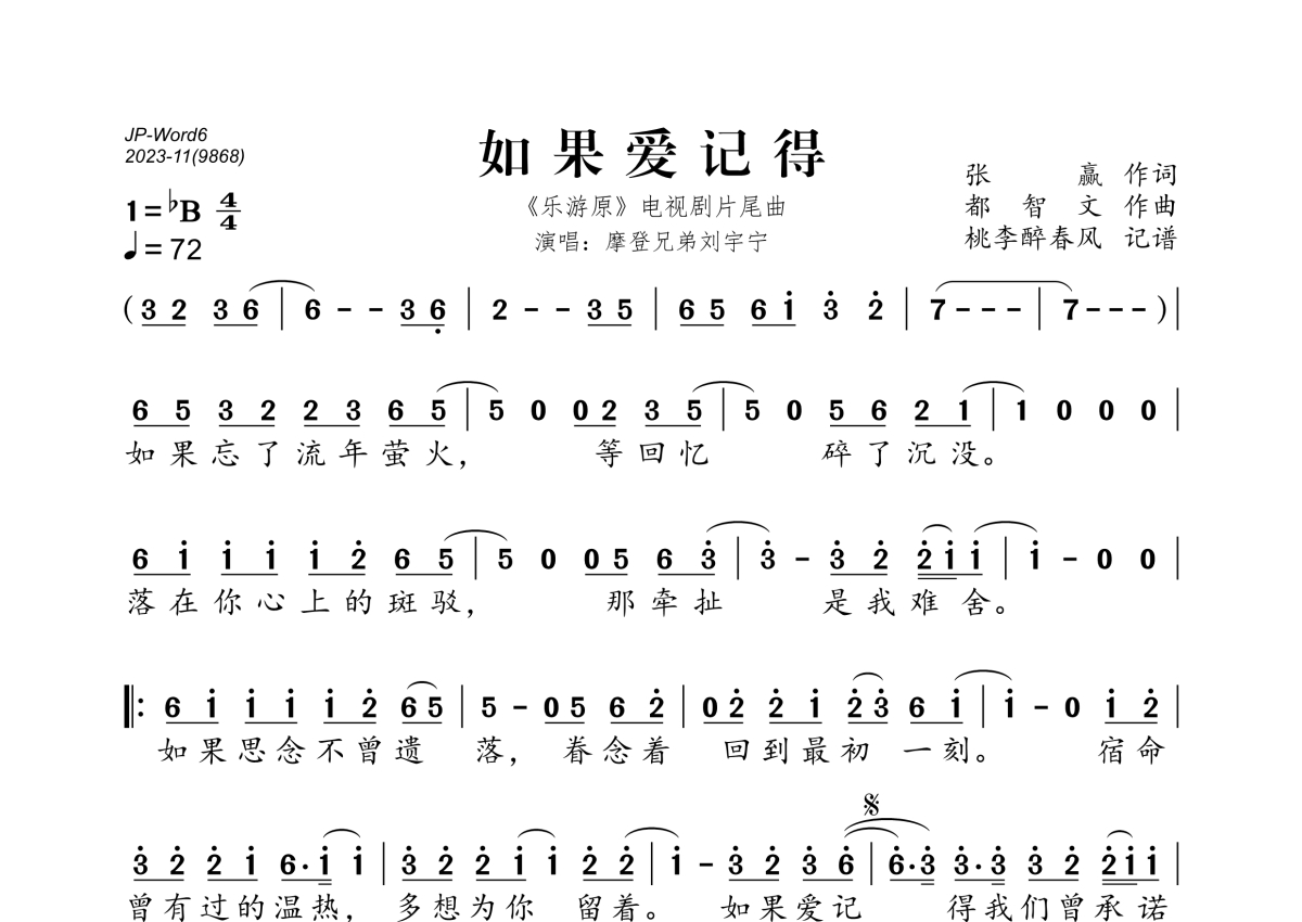 《如果爱记得》是摩登兄弟刘宇宁演唱的一首歌曲,拍号为4/4拍,歌曲速度为每分钟72拍,这份简谱共有一张高清图谱,图谱由 @桃李醉春风 编配上传。