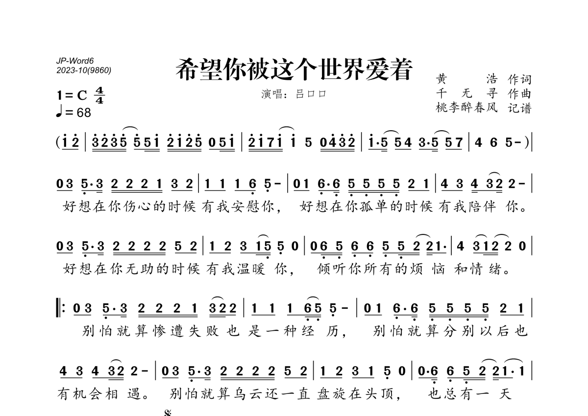 《希望你被这个世界爱着》是吕口口演唱的一首歌曲,拍号为4/4拍,歌曲速度为每分钟68拍,这份简谱共有一张高清图谱,图谱由 @桃李醉春风 编配上传。
