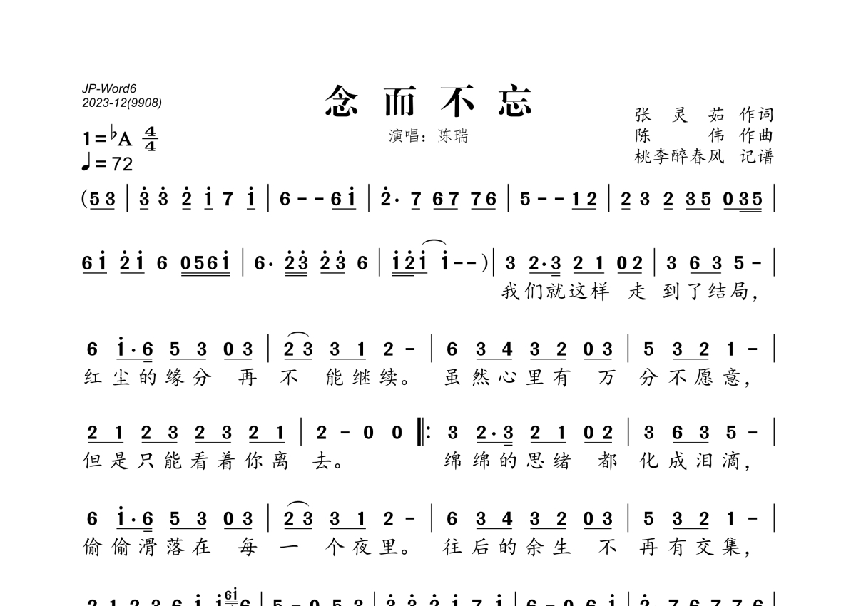 《念而不忘》是陈瑞演唱的一首歌曲,拍号为4/4拍,歌曲速度为每分钟72拍,这份简谱共有一张高清图谱,图谱由 @桃李醉春风 编配上传。