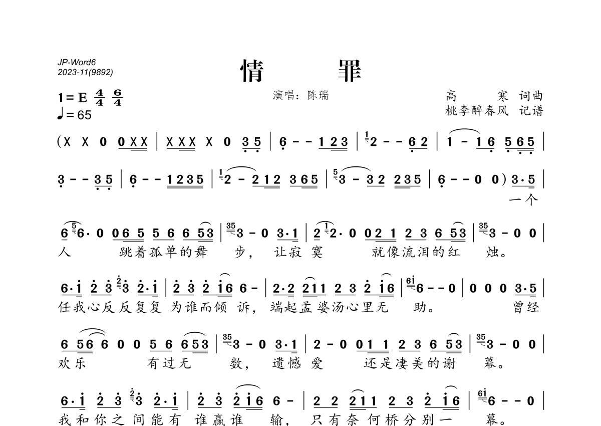 《情罪》是陈瑞演唱的一首歌曲,拍号为4/4拍,歌曲速度为每分钟65拍,这份简谱共有一张高清图谱,图谱由 @桃李醉春风 编配上传。