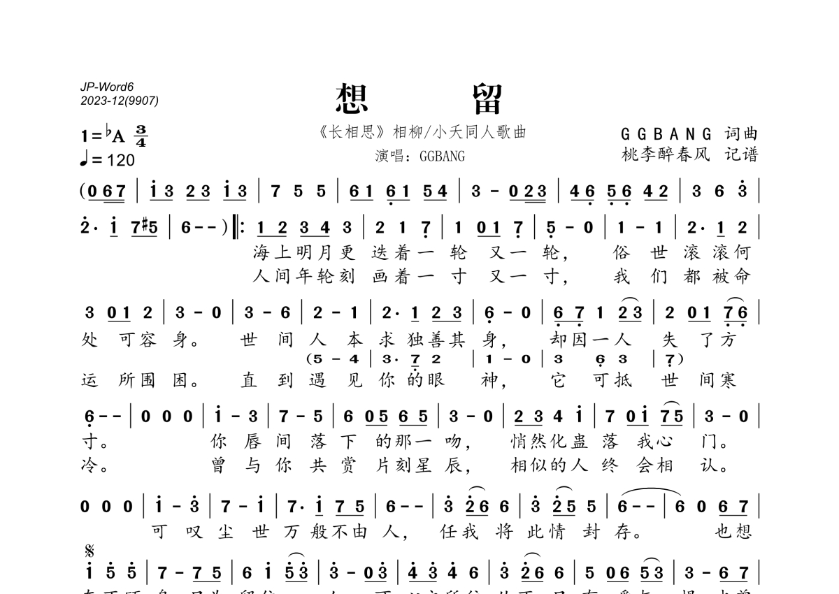 《想留》是GGBANG演唱的一首歌曲,拍号为3/4拍,歌曲速度为每分钟120拍,这份简谱共有一张高清图谱,图谱由 @桃李醉春风 编配上传。