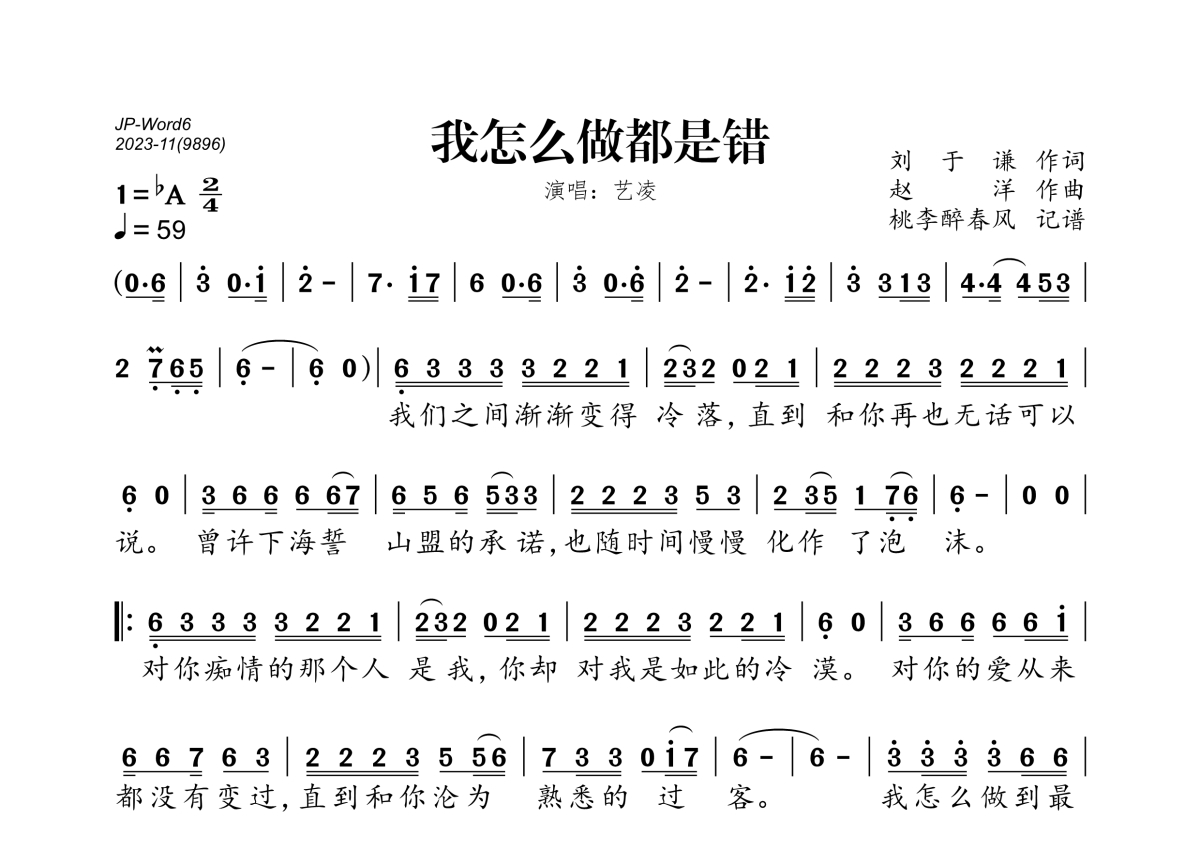 《我怎么做都是错》是艺凌演唱的一首歌曲,拍号为2/4拍,歌曲速度为每分钟59拍,这份简谱共有一张高清图谱,图谱由 @桃李醉春风 编配上传。