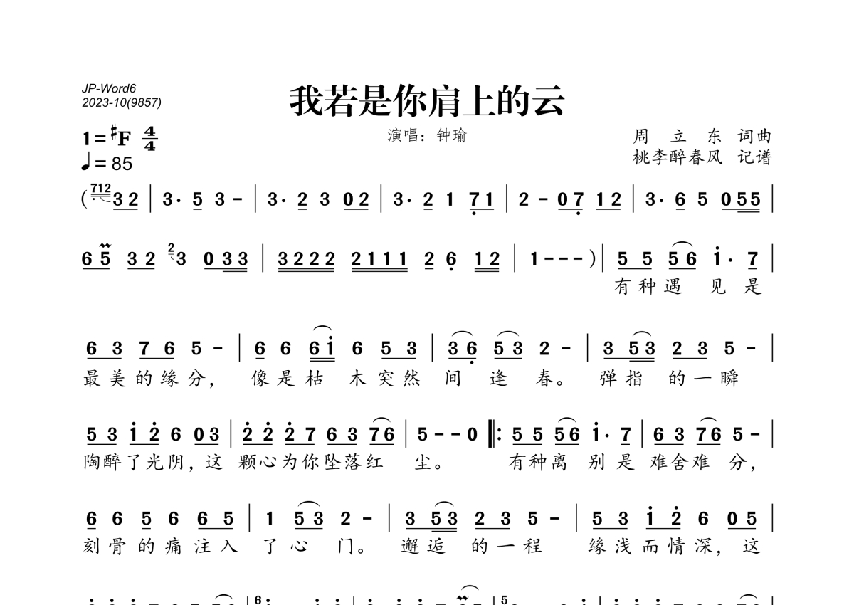 《我若是你肩上的云》是仲瑜演唱的一首歌曲,拍号为4/4拍,歌曲速度为每分钟85拍,这份简谱共有一张高清图谱,图谱由 @桃李醉春风 编配上传。