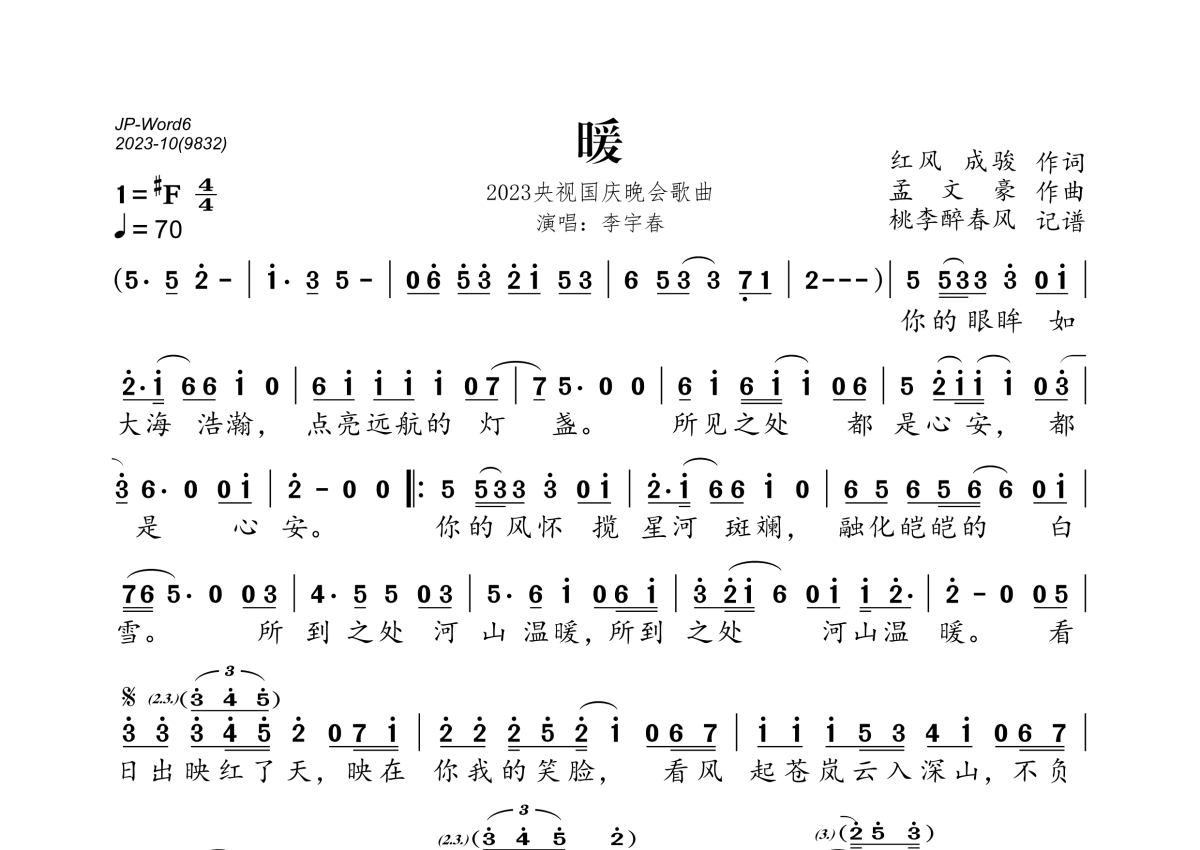 《暖》是李宇春演唱的一首歌曲,拍号为4/4拍,歌曲速度为每分钟70拍,这份简谱共有一张高清图谱,图谱由 @桃李醉春风 编配上传。
