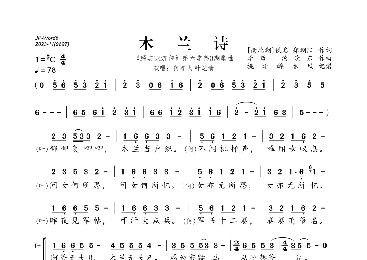 《木兰诗》是何赛飞/叶炫清演唱的一首歌曲,拍号为4/4拍,歌曲速度为每分钟78拍,这份简谱共有两张高清图谱,图谱由 @桃李醉春风 编配上传。