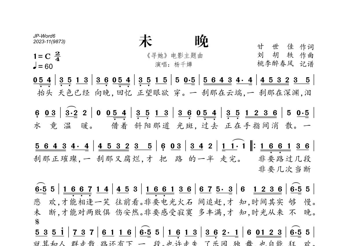 《未晚》是杨千嬅演唱的一首歌曲,拍号为2/4拍,歌曲速度为每分钟60拍,这份简谱共有一张高清图谱,图谱由 @桃李醉春风 编配上传。