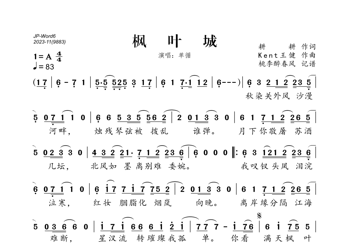 《枫叶城》是单循演唱的一首歌曲,拍号为4/4拍,歌曲速度为每分钟83拍,这份简谱共有一张高清图谱,图谱由 @桃李醉春风 编配上传。