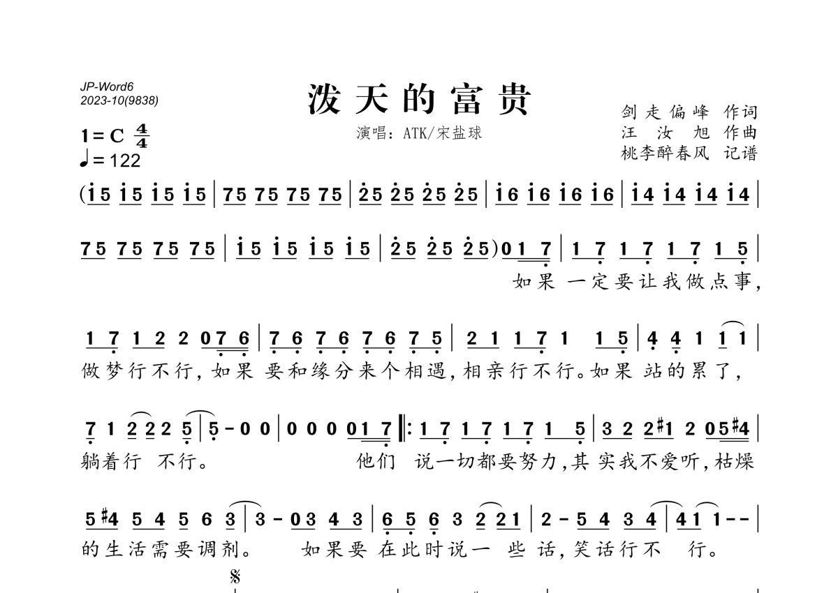 《泼天的富贵》是ATK、宋盐球演唱的一首歌曲,拍号为4/4拍,歌曲速度为每分钟122拍,这份简谱共有一张高清图谱,图谱由 @桃李醉春风 编配上传。