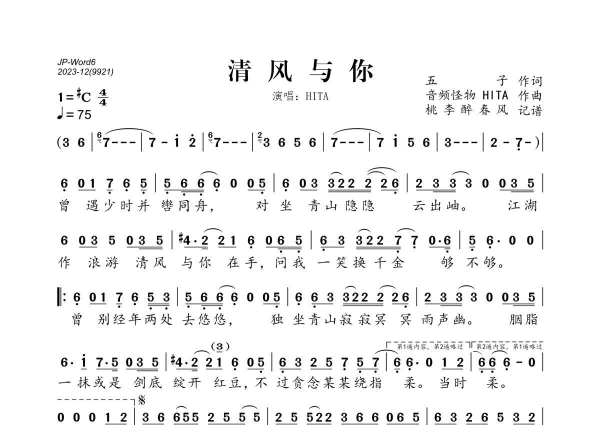 《清风与你》是HITA演唱的一首歌曲,拍号为4/4拍,歌曲速度为每分钟75拍,这份简谱共有一张高清图谱,图谱由 @桃李醉春风 编配上传。