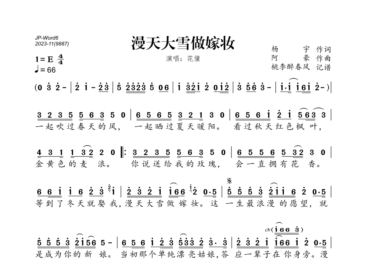 《漫天大雪做嫁妆》是花僮演唱的一首歌曲,拍号为4/4拍,歌曲速度为每分钟66拍,这份简谱共有一张高清图谱,图谱由 @桃李醉春风 编配上传。