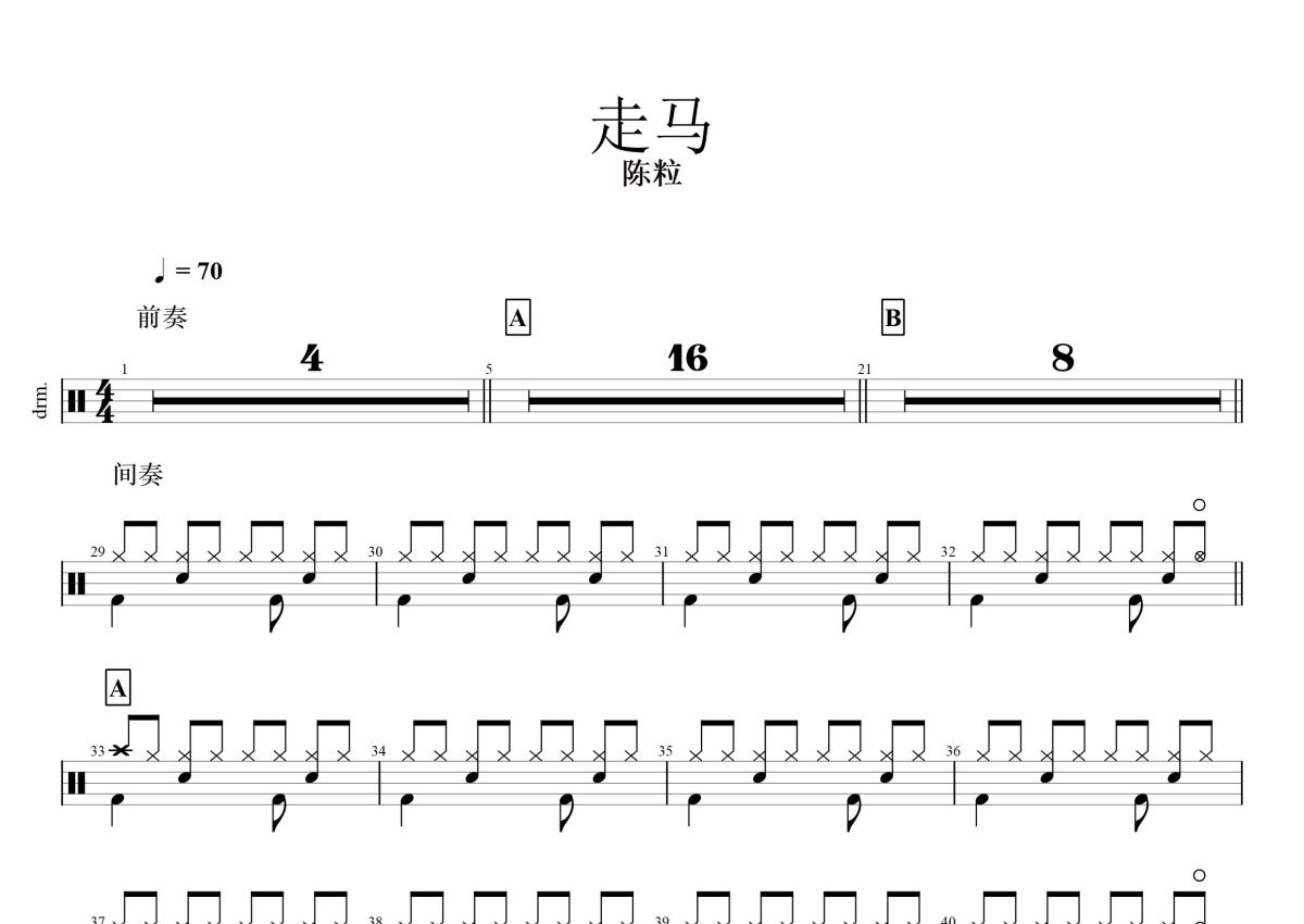 《走马》是陈粒演唱的一首歌曲,这份鼓谱共有一张高清图谱,图谱由 @打鼓谱 编配上传,图谱使用五线谱编配,使用这份走马架子鼓谱,你将能够轻松地敲打出这首陈粒的走马,快来尝试吧。走马为陈粒首张专辑《如也》 中的曲目。 专辑发行时间为2015年2月2日。歌曲《走马》清新靓丽,坚定了陈粒演唱的曲风,形成自己的风格。 摩登兄弟刘宇宁曾翻唱过这首《走马》。 。