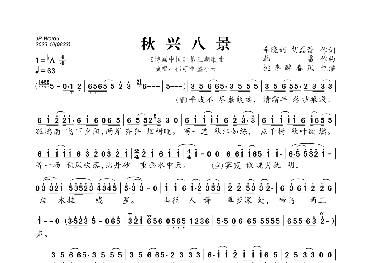 《秋兴八景》是盛小云、郁可唯演唱的一首歌曲,拍号为4/4拍,歌曲速度为每分钟63拍,这份简谱共有一张高清图谱,图谱由 @桃李醉春风 编配上传。