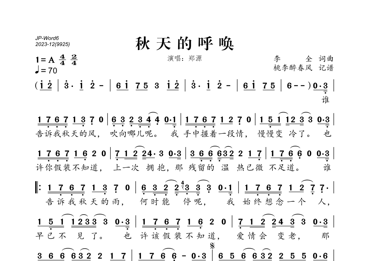 《秋天的呼唤》是郑源演唱的一首歌曲,拍号为4/4拍,歌曲速度为每分钟70拍,这份简谱共有一张高清图谱,图谱由 @桃李醉春风 编配上传。