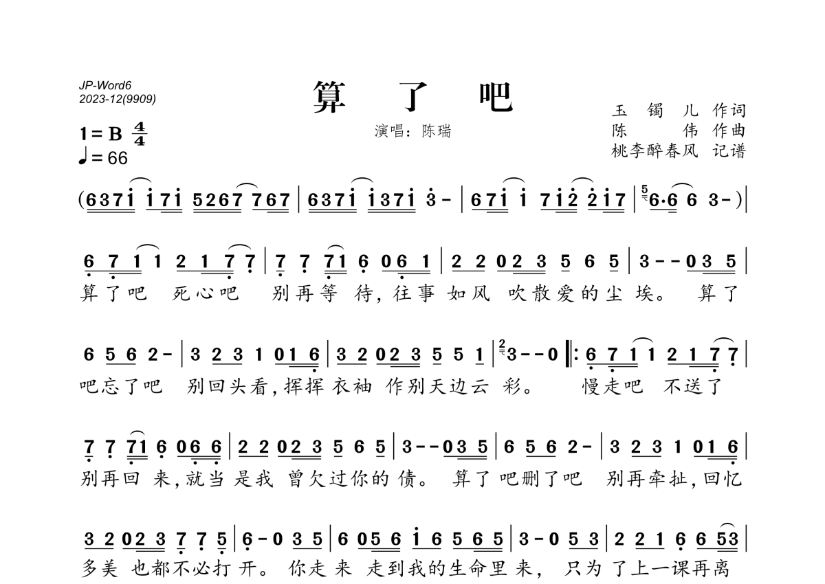 《算了吧》是陈瑞演唱的一首歌曲,拍号为4/4拍,歌曲速度为每分钟66拍,这份简谱共有一张高清图谱,图谱由 @桃李醉春风 编配上传。