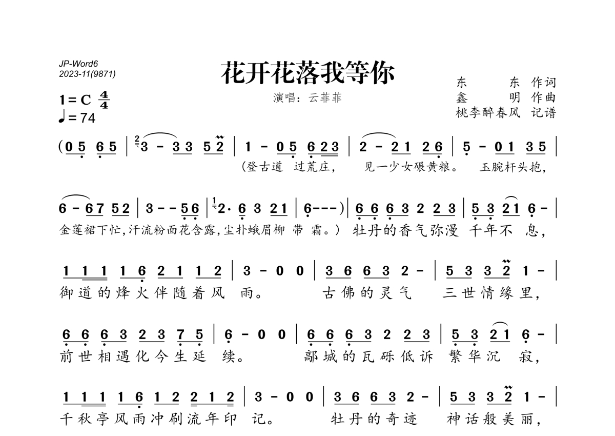 云菲菲《花开花落我等你》简谱