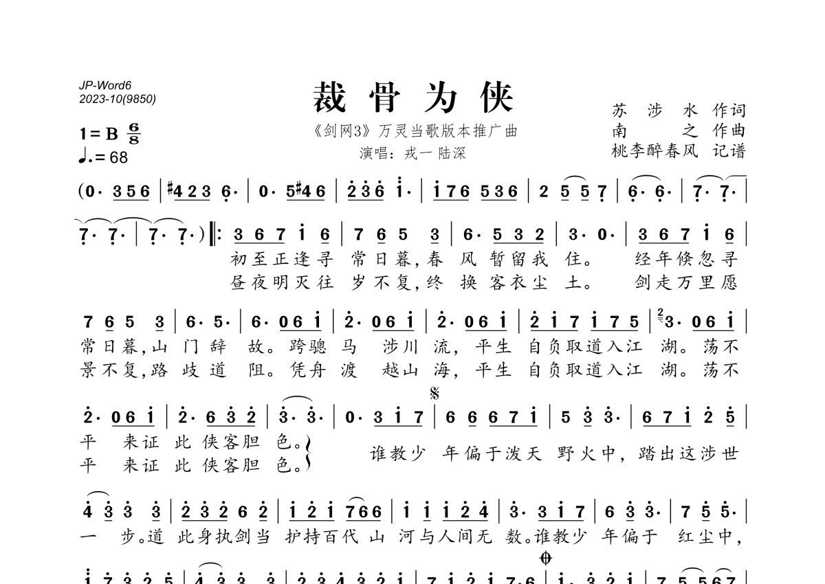 《裁骨为侠》是: 剑网3/戎一Neo/陆深演唱的一首歌曲,拍号为6/8拍,歌曲速度为每分钟68拍,这份简谱共有一张高清图谱,图谱由 @桃李醉春风 编配上传。