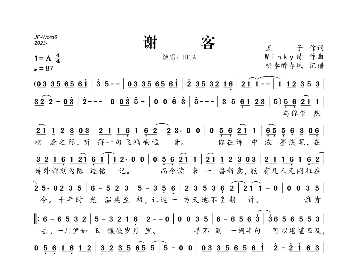 《谢客》是HITA演唱的一首歌曲,拍号为4/4拍,歌曲速度为每分钟87拍,这份简谱共有一张高清图谱,图谱由 @桃李醉春风 编配上传。