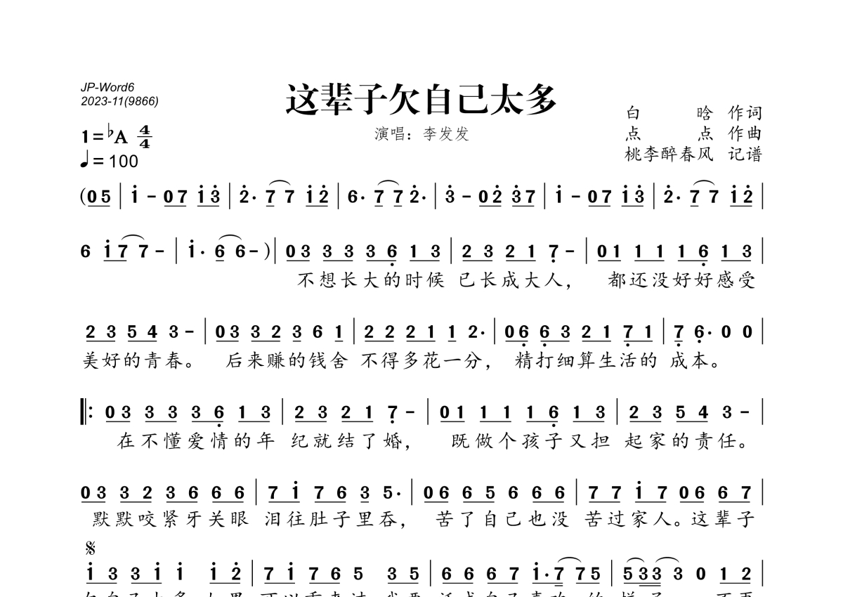 《这辈子欠自己太多》是李发发演唱的一首歌曲,拍号为4/4拍,歌曲速度为每分钟100拍,这份简谱共有一张高清图谱,图谱由 @桃李醉春风 编配上传。