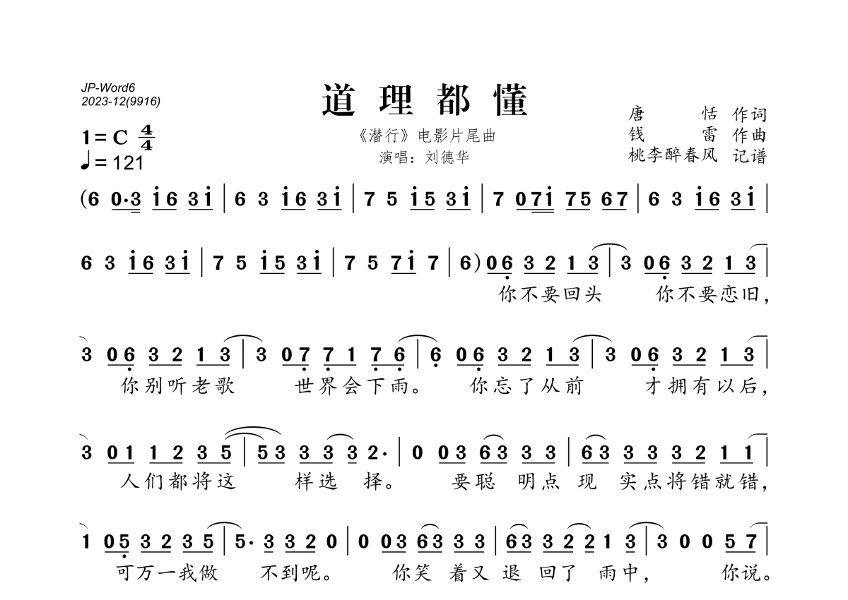 《道理都懂》是刘德华演唱的一首歌曲,拍号为4/4拍,歌曲速度为每分钟121拍,这份简谱共有两张高清图谱,图谱由 @桃李醉春风 编配上传。