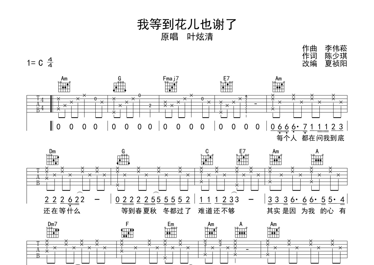 叶炫清《我等到花儿也谢了》吉他谱 - C调弹唱六线谱