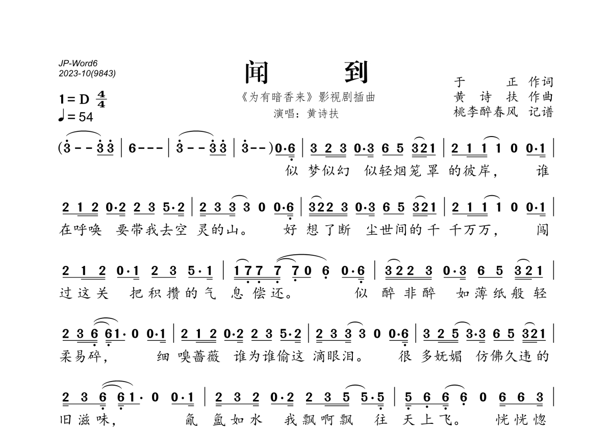 《闻到》是黄诗然演唱的一首歌曲,拍号为4/4拍,歌曲速度为每分钟54拍,这份简谱共有一张高清图谱,图谱由 @桃李醉春风 编配上传。