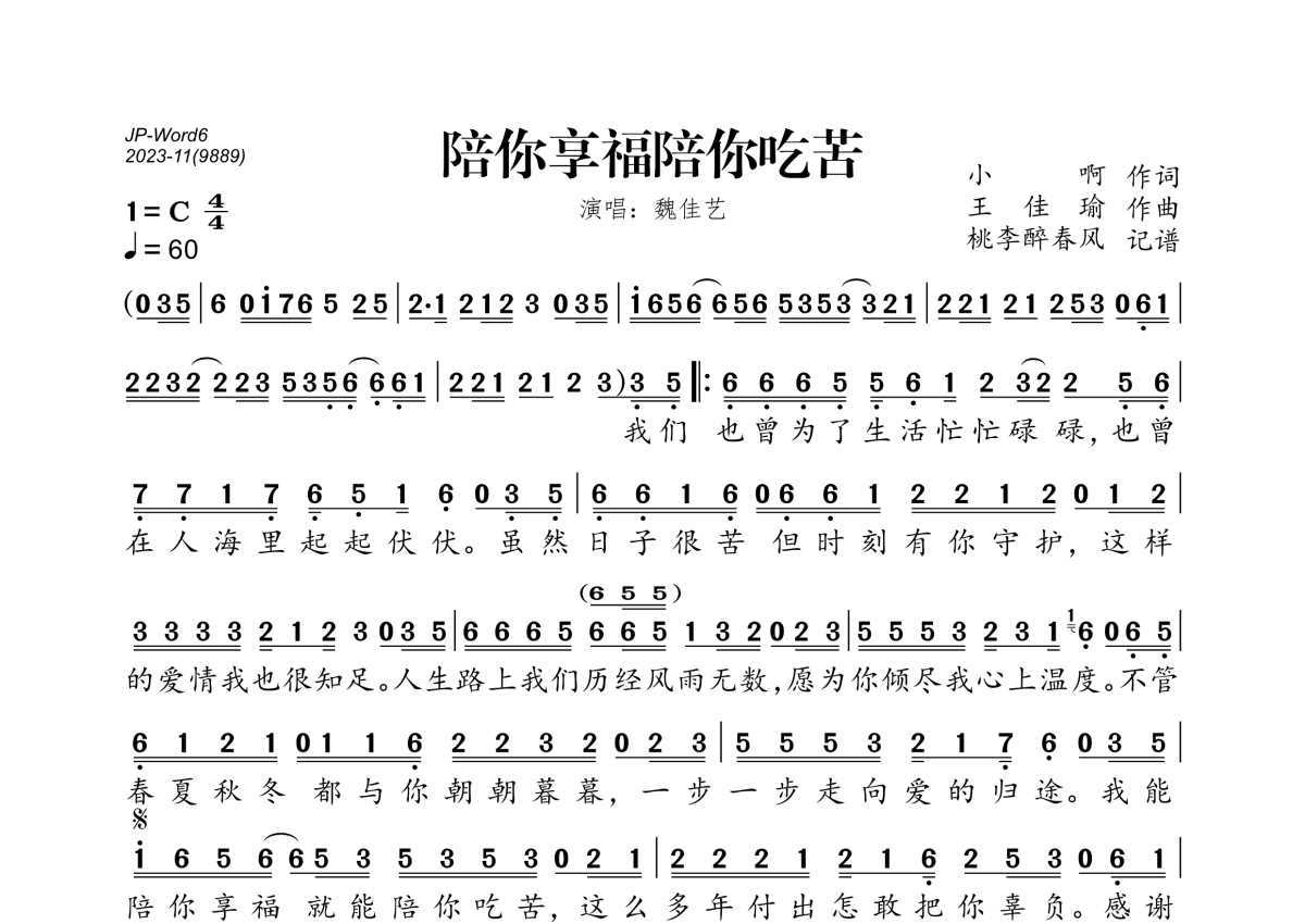 《陪你享福陪你吃苦》是魏佳艺演唱的一首歌曲,拍号为4/4拍,歌曲速度为每分钟60拍,这份简谱共有一张高清图谱,图谱由 @桃李醉春风 编配上传。