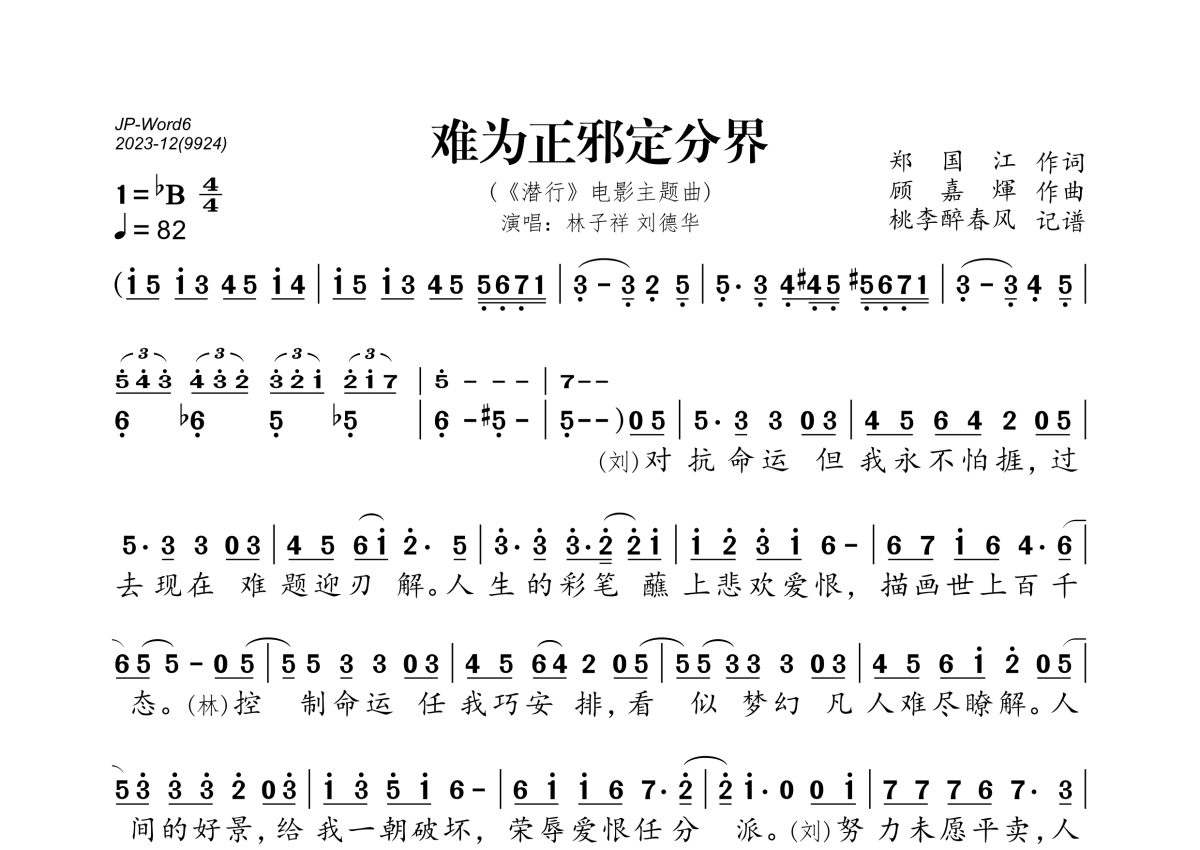 《难为正邪定分界》是林子祥/刘德华演唱的一首歌曲,拍号为4/4拍,歌曲速度为每分钟82拍,这份简谱共有两张高清图谱,图谱由 @桃李醉春风 编配上传。
