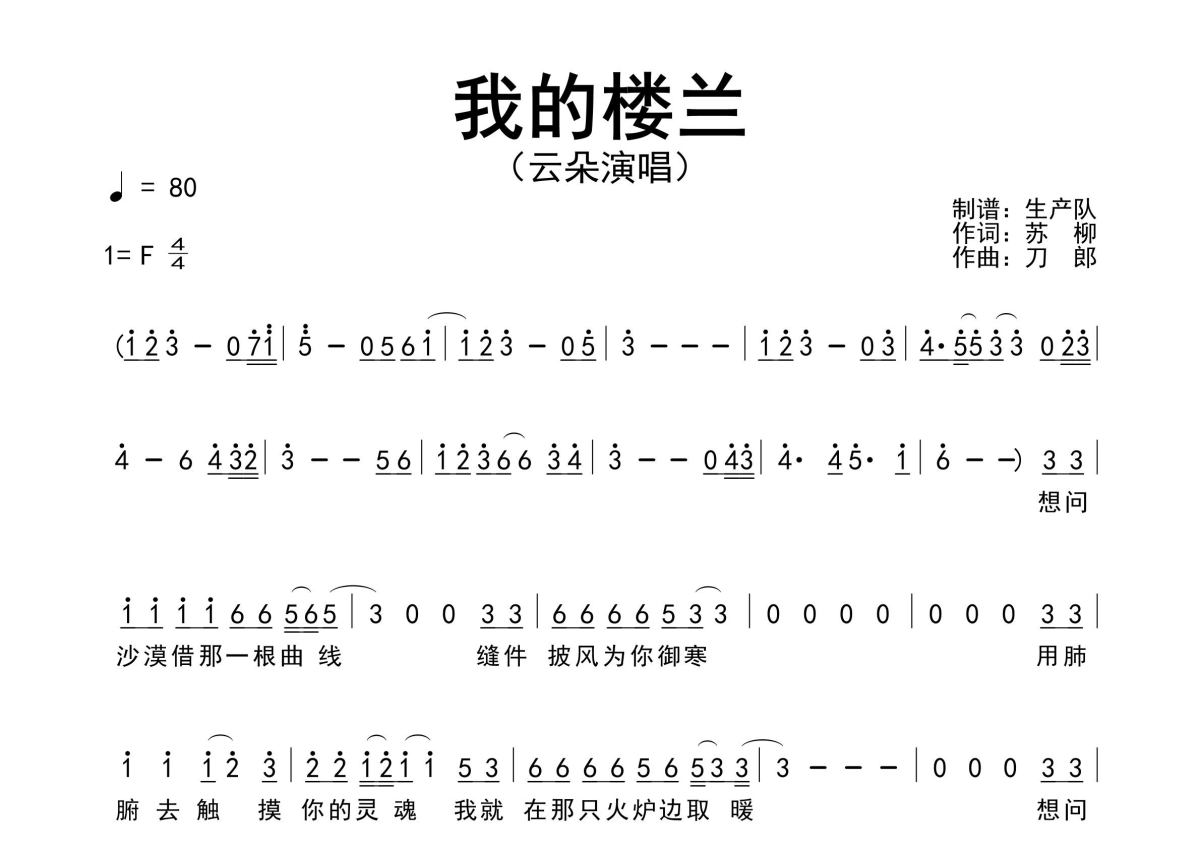 《我的楼兰》是云朵演唱的一首歌曲,原版简谱,拍号为4/4拍,歌曲速度为每分钟80拍,这份简谱共有两张高清图谱,图谱由 @生产队 编配上传云朵演唱的经典歌曲《我的楼兰》原版简谱,完整的前奏、间奏、尾奏编配。
