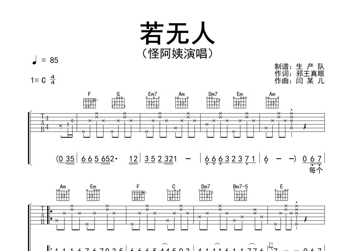 《若无人》是怪阿姨演唱的一首歌曲,精编完美版,拍号为4/4拍,歌曲速度为每分钟85拍,歌曲原调为C调,本吉他谱采用的是C调指法编配,演奏时不需要使用变调夹即为原调,这份吉他谱共有两张高清图谱,图谱由 @生产队 编配上传,图谱使用六线谱编配,包含吉他和弦指法、简谱以及歌词部分,使用这份若无人吉他谱,可以让你更加方便地掌握这首歌曲的弹唱技巧,快来尝试吧。怪阿姨演唱的民谣歌曲《若无人》原版吉他谱,完整的前奏、间奏编配。