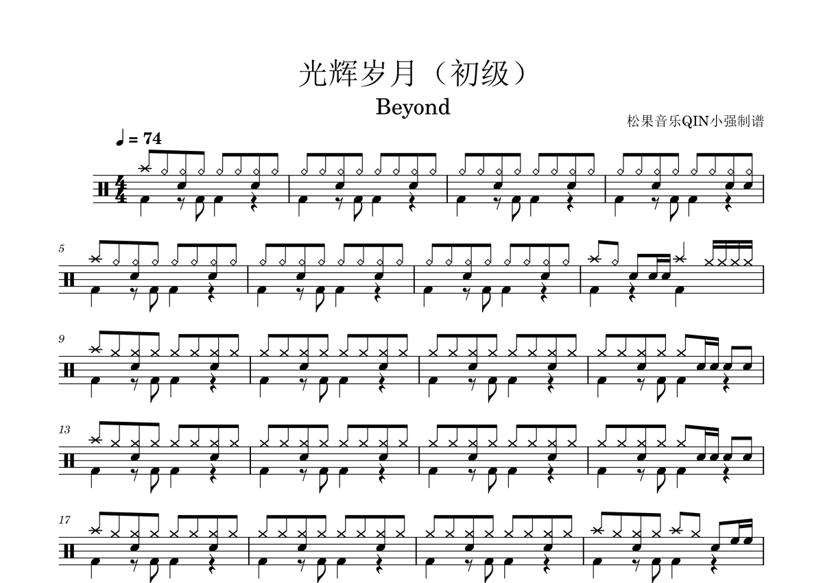 《光辉岁月(初级)》是初级演唱的一首歌曲,拍号为4/4拍,这份架子鼓谱共有两张高清图谱,图谱由 @松果音乐QIN小强 编配上传,图谱使用五线谱编配,使用这份光辉岁月(初级)架子鼓谱,你将能够轻松地敲打出这首初级的光辉岁月(初级),快来尝试吧。《光辉岁月》是中国香港摇滚乐队Beyond演唱的一首歌曲,由黄家驹作曲,Beyond编曲 。该曲分粤语、普通话两个版本,粤语版由黄家驹填词,收录在Beyond1990年9月发行的粤语专辑《命运派对》中 ;普通话版由何启弘、周治平填词,收录在Beyond1991年4月发行的普通话专辑《光辉岁月》中 。该曲是黄家驹为南非黑人领袖纳尔逊·罗利赫拉赫拉·曼德拉创作的一首作品。