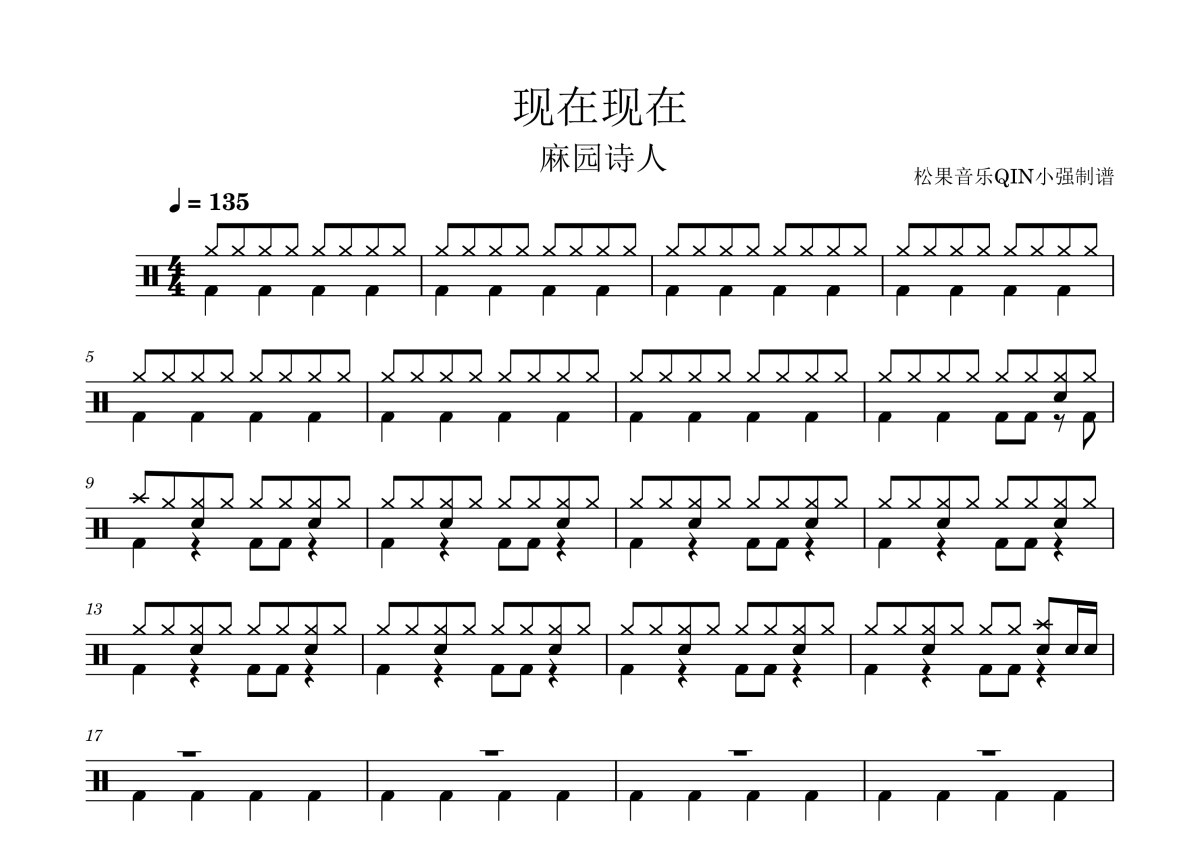《现在现在》是麻园诗人演唱的一首歌曲,拍号为4/4拍,这份架子鼓谱共有四张高清图谱,图谱由 @松果音乐QIN小强 编配上传,图谱使用五线谱编配,使用这份现在现在架子鼓谱,你将能够轻松地敲打出这首麻园诗人的现在现在,快来尝试吧。《现在现在》是麻园诗人演唱的歌曲,由苦果作词,苦果作曲,张彧 苦果编曲。