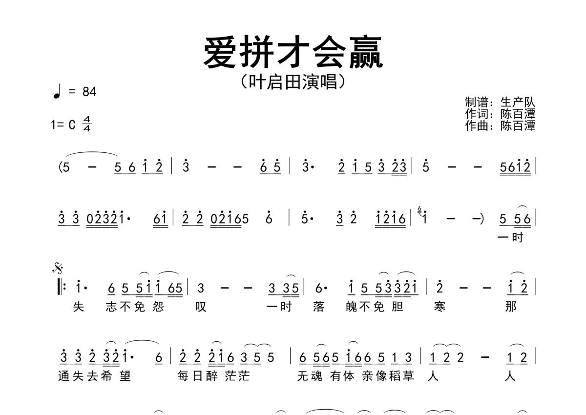《爱拼才会赢》是叶启田演唱的一首歌曲,原版简谱,拍号为4/4拍,歌曲速度为每分钟84拍,这份简谱共有一张高清图谱,图谱由 @生产队 编配上传叶启田演唱的经典歌曲《爱拼才会赢》原版简谱,完整的前奏、间奏、尾奏solo编配。