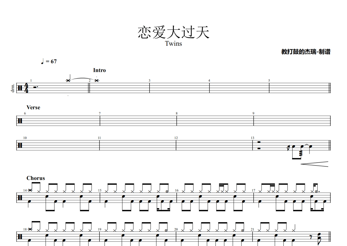 《恋爱大过天》是Twins演唱的一首歌曲,拍号为4/4拍,歌曲速度为每分钟67拍,这份架子鼓谱共有两张高清图谱,图谱由 @Jerry 编配上传,图谱使用五线谱编配,使用这份恋爱大过天架子鼓谱,你将能够轻松地敲打出这首Twins的恋爱大过天,快来尝试吧。