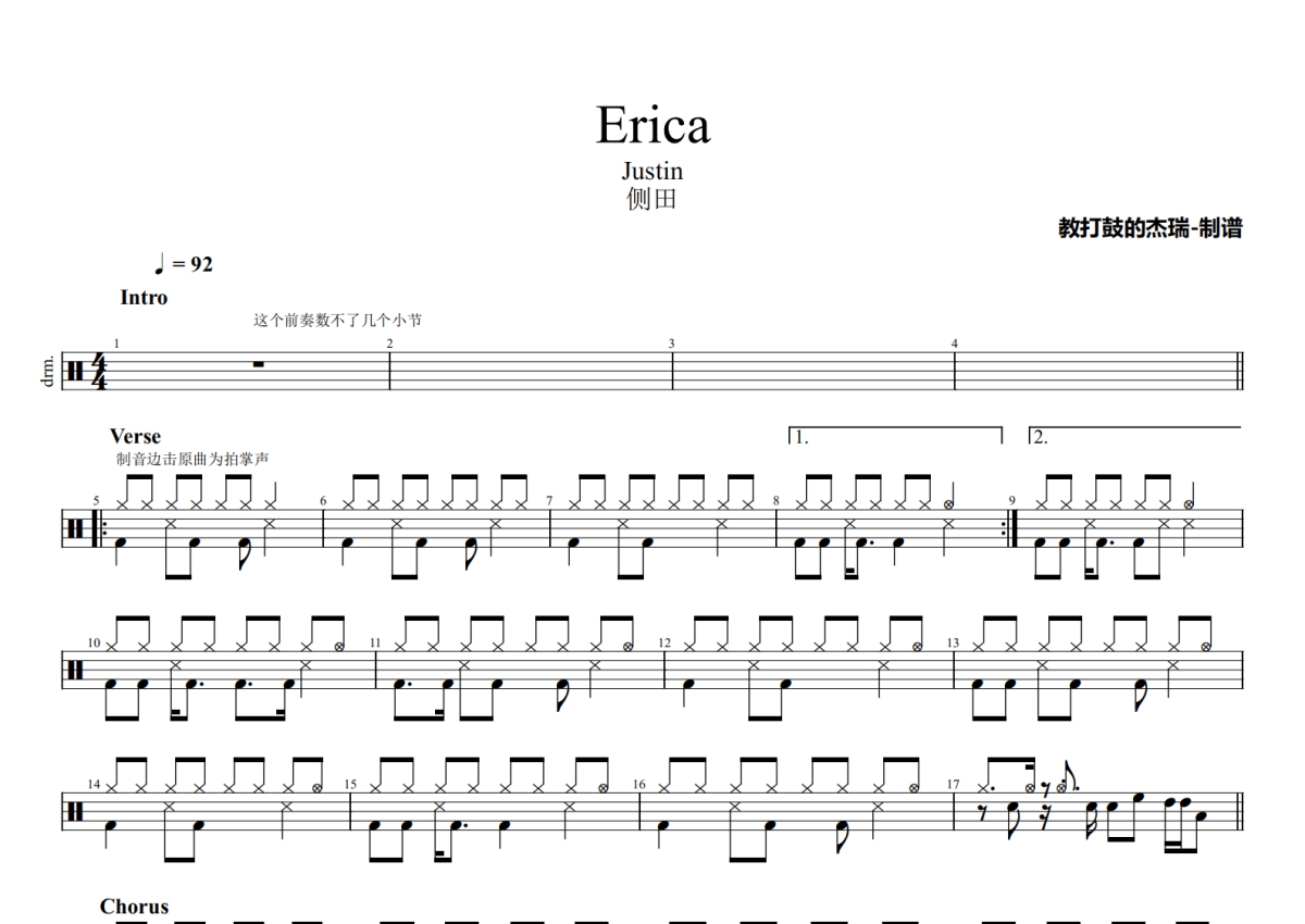 《Erica》是侧田演唱的一首歌曲,拍号为4/4拍,歌曲速度为每分钟92拍,这份架子鼓谱共有两张高清图谱,图谱由 @Jerry 编配上传,图谱使用五线谱编配,使用这份Erica架子鼓谱,你将能够轻松地敲打出这首侧田的Erica,快来尝试吧。