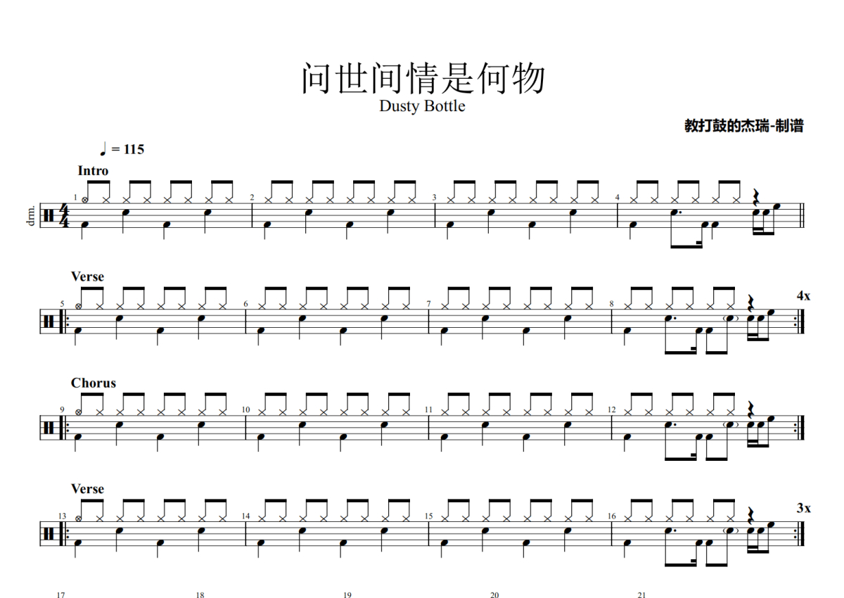《问世间情是何物》是Dusty Bottle演唱的一首歌曲,拍号为4/4拍,歌曲速度为每分钟115拍,这份架子鼓谱共有一张高清图谱,图谱由 @Jerry 编配上传,图谱使用五线谱编配,使用这份问世间情是何物架子鼓谱,你将能够轻松地敲打出这首Dusty Bottle的问世间情是何物,快来尝试吧。