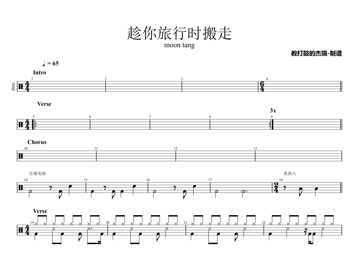 《趁你旅行时搬走》是moon tang演唱的一首歌曲,拍号为4/4拍,歌曲速度为每分钟65拍,这份架子鼓谱共有两张高清图谱,图谱由 @Jerry 编配上传,图谱使用五线谱编配,使用这份趁你旅行时搬走架子鼓谱,你将能够轻松地敲打出这首moon tang的趁你旅行时搬走,快来尝试吧。