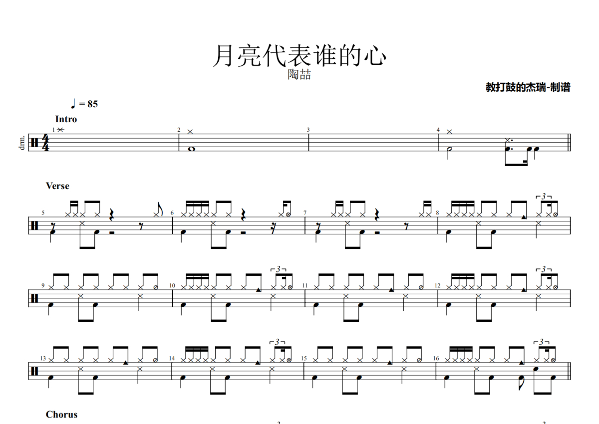 《月亮代表谁的心》是陶喆演唱的一首歌曲,拍号为4/4拍,歌曲速度为每分钟85拍,这份架子鼓谱共有两张高清图谱,图谱由 @Jerry 编配上传,图谱使用五线谱编配,使用这份月亮代表谁的心架子鼓谱,你将能够轻松地敲打出这首陶喆的月亮代表谁的心,快来尝试吧。