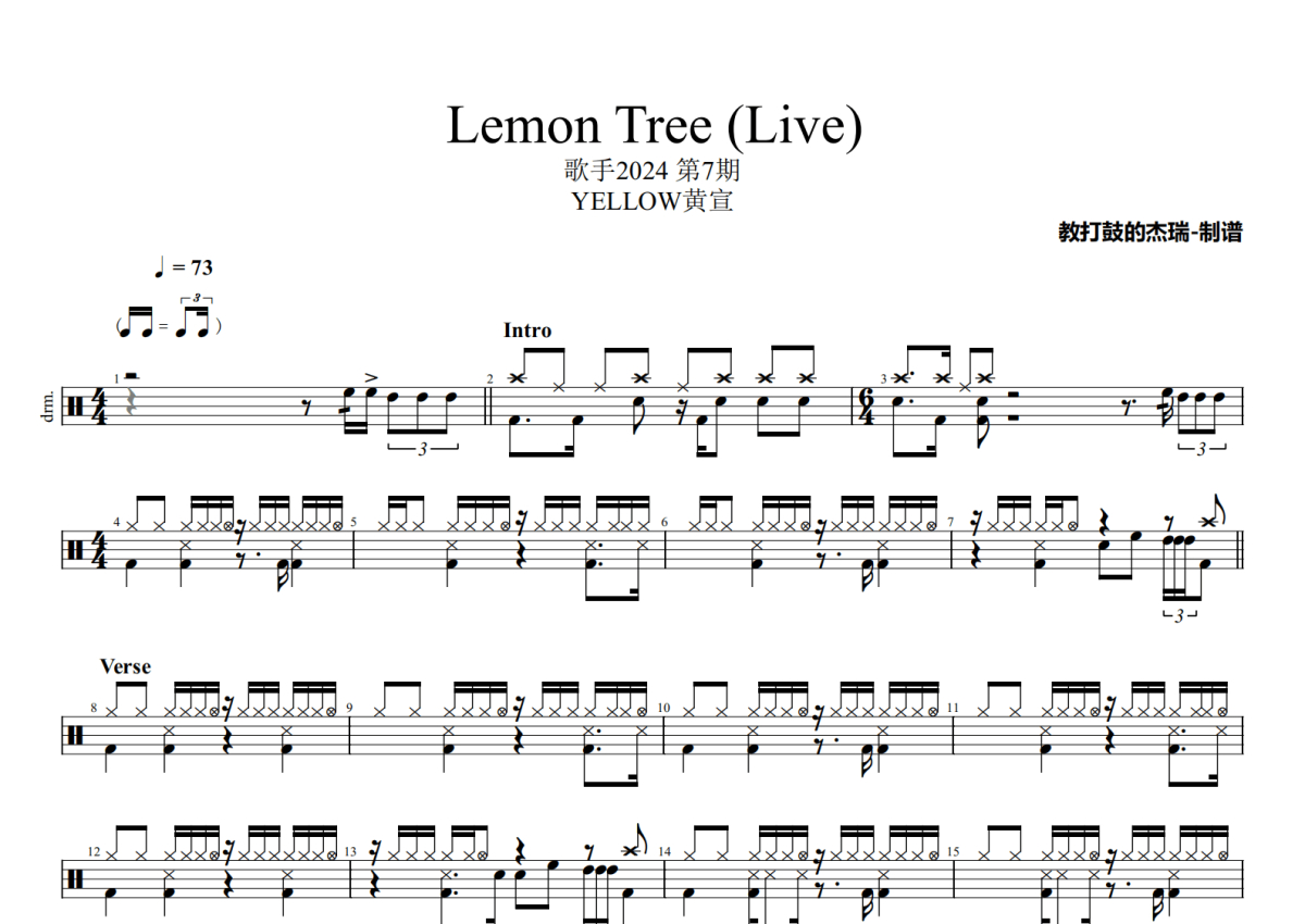 YELLOW黄宣《Lemon Tree (Live)》架子鼓谱 - 歌手2024 第7期