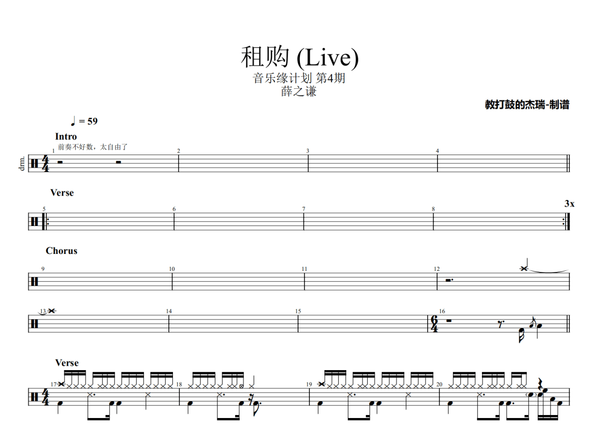 《租购 (Live)》是薛之谦演唱的一首歌曲,音乐缘计划 第4期,拍号为4/4拍,歌曲速度为每分钟59拍,这份架子鼓谱共有两张高清图谱,图谱由 @Jerry 编配上传,图谱使用五线谱编配,使用这份租购 (Live)架子鼓谱,你将能够轻松地敲打出这首薛之谦的租购 (Live),快来尝试吧。