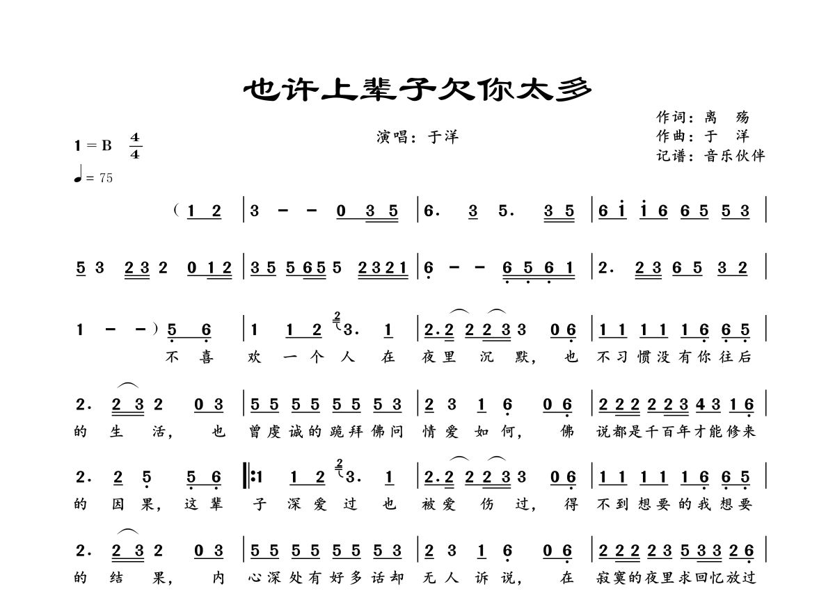 《也许上辈子欠你太多》是于洋演唱的一首歌曲,拍号为4/4拍,歌曲速度为每分钟75拍,这份简谱共有一张高清图谱,图谱由 @音乐伙伴 编配上传。
