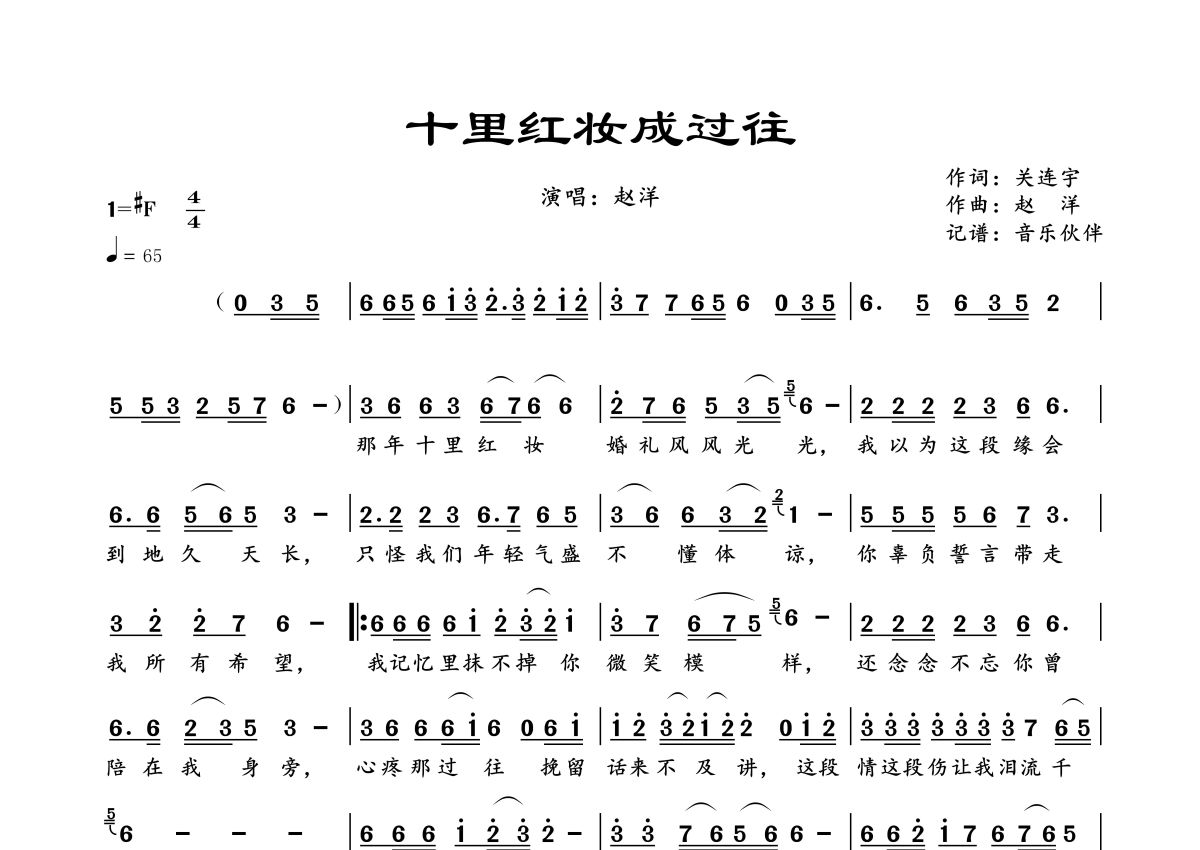 《十里红妆成过往》是赵洋演唱的一首歌曲,拍号为4/4拍,歌曲速度为每分钟65拍,这份简谱共有一张高清图谱,图谱由 @音乐伙伴 编配上传。